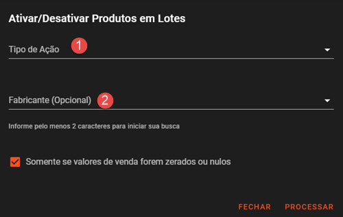 Se desejar ativar ou desativar uma grande quantidade de produtos, seja especificado por fabricante ou se quiser apenas desativar produtos cujo o preço de venda está zerado, isso é possível com esse recurso.