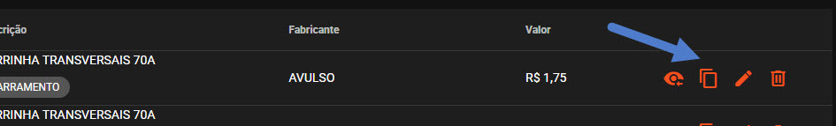 Ao clicar no ícone de duplicação, o produto é copiado integralmente, exceto pela parte de estoque.