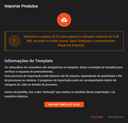 Na tela seguinte escolha o arquivo no formato .XLSX para importar os produtos. Baixe o template que contém para ver como funciona o padrão que deve ser adotado.