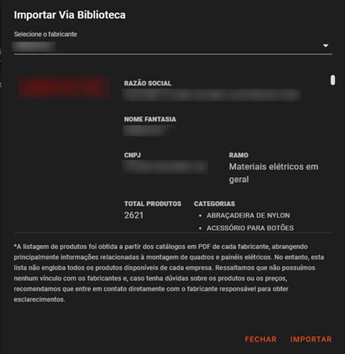 Na tela seguinte escolha o fabricante e veja os detalhes especificados. Essa tela tem as informações da empresa, nome, total de produtos e a versão da lista, assim como as categorias que serão importadas. Após isso basta clicar em Importar.