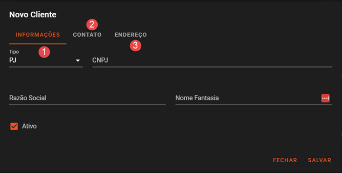 Contato: 2 Inclui informações de contato do cliente, como endereço, responsável e telefone;