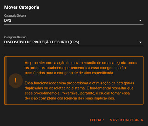 Na tela seguinte, defina a categoria de origem e destino e depois clique na ação de mover a categoria. Nesse processo o sistema inicia o processo de transferência de uma para outra.