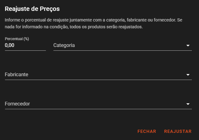 O recurso de reajuste de preços permite que você faça alterações nos preços dos produtos de forma rápida e eficiente pela categoria do produto. Isso ajuda a manter seus preços atualizados e refletir as mudanças no mercado, garantindo uma gestão de preços mais precisa e ágil.