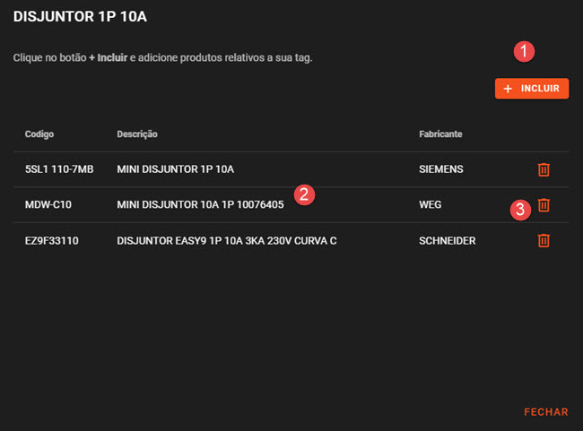 Cada tag possui os botões de controle, que são para 5 associar produtos, 6 editar e 7deletar;