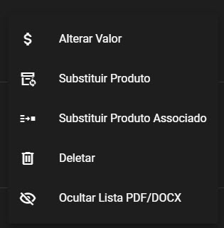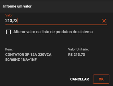 - Alterar valor: altera o valor do produto selecionado. Caso deseje alterar o valor da lista de produtos, selecione a opção do checkbox abaixo;