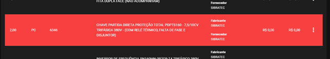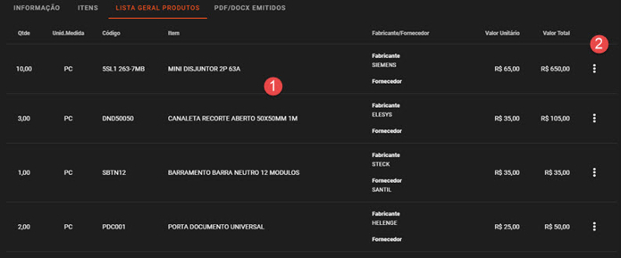 Nesta parte temos a listagem de produtos geral de todos os itens do orçamento referente ao produtos destinado a quadros ou painéis.